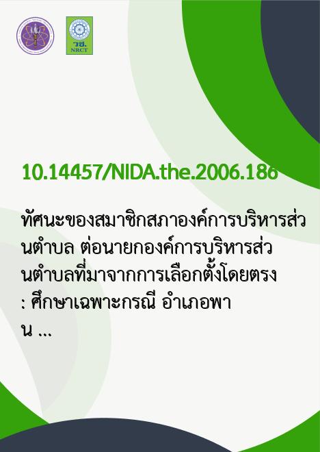 Title ทัศนะของสมาชิกสภาองค์การบริหารส่วนตำบล ต่อนายกองค์การบริหารส่วนตำบลที่มาจากการเลือกตั้งโดยตรง : ศึกษาเฉพาะกรณี อำเภอพาน จังหวัดเชียงราย /