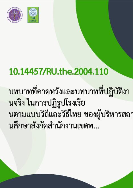 บทบาทที่คาดหวังและบทบาทที่ปฏิบัติงานจริง ในการปฏิรูปโรงเรียนตามแบบวิถีและวิธีไทย ของผู้บริหารสถานศึกษาสังกัดสำนักงานเขตพื้นที่การศึกษานนทบุรี เขต 2 /สุเพชร ยอดตา |