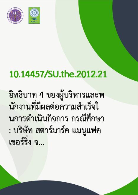 อิทธิบาท 4 ของผู้บริหารและพนักงานที่มีผลต่อความสำเร็จในการดำเนินกิจการ กรณีศึกษา : บริษัท สตาร์มาร์ค แมนูแฟคเชอร์ริ่ง จำกัด จังหวัดสมุทรสาคร |