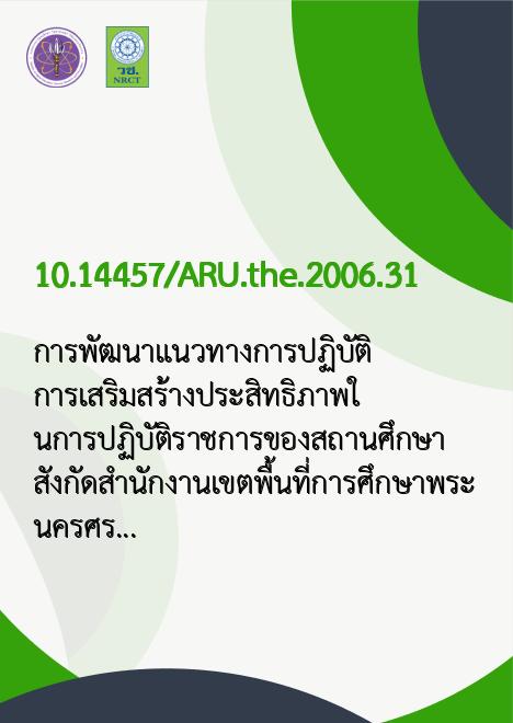| Title | การพัฒนาแนวทางการปฏิบัติ การเสริมสร้างประสิทธิภาพในการปฏิบัติราชการของสถานศึกษา สังกัดสำนักงานเขตพื้นที่การศึกษาพระนครศรีอยุธยา เขต 1 และเขต 2 / |