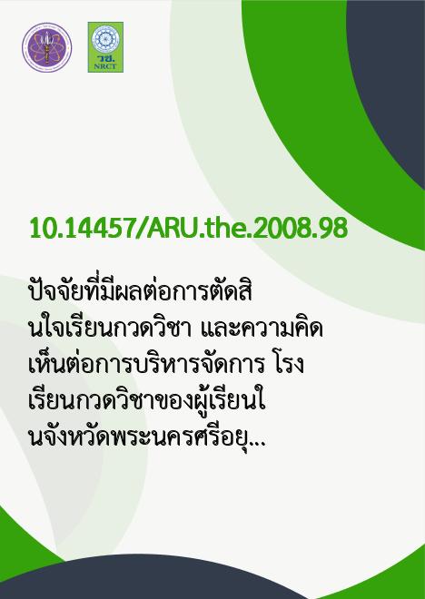 | Title | ปัจจัยที่มีผลต่อการตัดสินใจเรียนกวดวิชา และความคิดเห็นต่อการบริหารจัดการ โรงเรียนกวดวิชาของผู้เรียนในจังหวัดพระนครศรีอยุธยา / |
