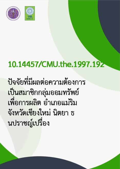 | Title | ปัจจัยที่มีผลต่อความต้องการเป็นสมาชิกกลุ่มออมทรัพย์เพื่อการผลิต อำเภอแม่ริม จังหวัดเชียงใหม่ / |