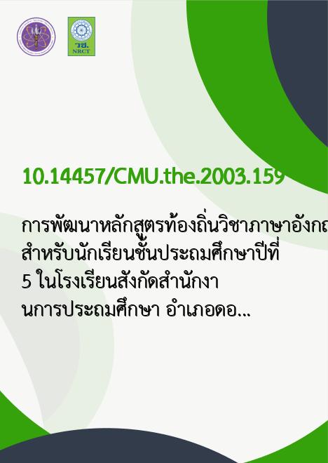 การพัฒนาหลักสูตรท้องถิ่นวิชาภาษาอังกฤษ สำหรับนักเรียนชั้นประถมศึกษาปีที่ 5 ในโรงเรียนสังกัดสำนักงานการประถมศึกษา อำเภอดอยสะเก็ด จังหวัดเชียงใหม่ /วิไลพร ชัยประสิทธิ์ |