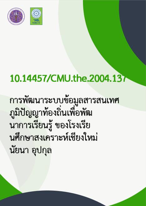 การพัฒนาระบบข้อมูลสารสนเทศ ภูมิปัญญาท้องถิ่นเพื่อพัฒนาการเรียนรู้ ของโรงเรียนศึกษาสงเคราะห์เชียงใหม่ /นัยนา อุปกุล |