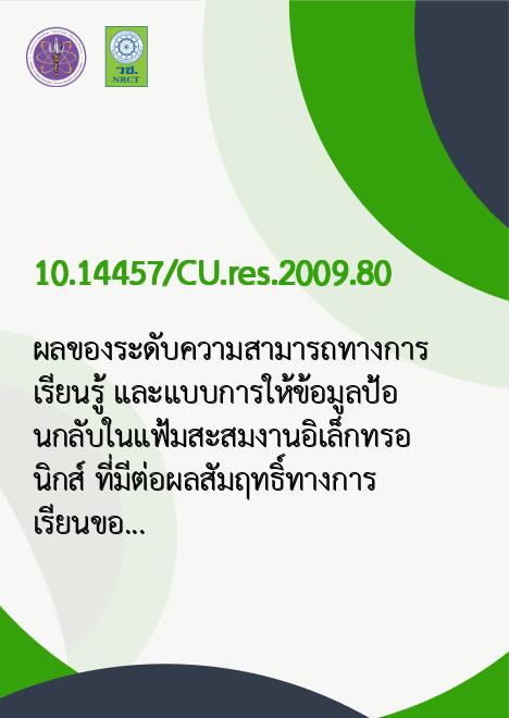 | Title | ผลของระดับความสามารถทางการเรียนรู้ และแบบการให้ข้อมูลป้อนกลับในแฟ้มสะสมงานอิเล็กทรอนิกส์ ที่มีต่อผลสัมฤทธิ์ทางการเรียนของนิสิต ในวิชาการผลิตสื่ออิเล็กทรอนิกส์เพื่อการศึกษา / |