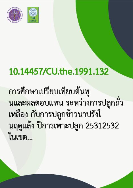 การศึกษาเปรียบเทียบต้นทุนและผลตอบแทน ระหว่างการปลูกถั่วเหลือง กับการปลูกข้าวนาปรังในฤดูแล้ง ปีการเพาะปลูก 2531/2532 ในเขตภาคตะวันออกเฉียงเหนือ |