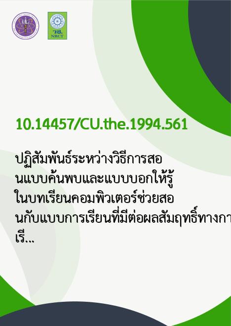ปฏิสัมพันธ์ระหว่างวิธีการสอนแบบค้นพบและแบบบอกให้รู้ ในบทเรียนคอมพิวเตอร์ช่วยสอนกับแบบการเรียนที่มีต่อผลสัมฤทธิ์ทางการเรียน วิชาคณิตศาสตร์ ของนักศึกษาระดับประกาศนียบัตรวิชาชีพ |