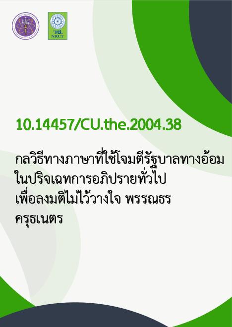 กลวิธีทางภาษาที่ใช้โจมตีรัฐบาลทางอ้อม ในปริจเฉทการอภิปรายทั่วไปเพื่อลงมติไม่ไว้วางใจ /พรรณธร ครุธเนตร |