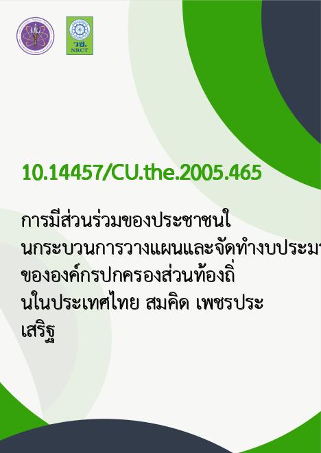 | Title | การมีส่วนร่วมของประชาชนในกระบวนการวางแผนและจัดทำงบประมาณ ขององค์กรปกครองส่วนท้องถิ่นในประเทศไทย / |