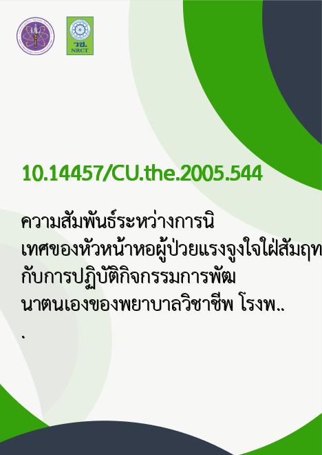 | Keyword | หัวหน้าหอผู้ป่วย, การนิเทศการพยาบาล, แรงจูงใจใฝ่สัมฤทธิ์, พยาบาล, การพัฒนาตนเอง |
