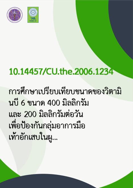 การศึกษาเปรียบเทียบขนาดของวิตามินบี 6 ขนาด 400 มิลลิกรัม และ 200 มิลลิกรัมต่อวัน เพื่อป้องกันกลุ่มอาการมือเท้าอักเสบในผู้ป่วยมะเร็ง ที่ได้รับยาเคปไซตาบีน /เทพ เฉลิมชัย |