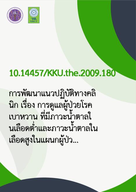 การพัฒนาแนวปฏิบัติทางคลินิก เรื่อง การดูแลผู้ป่วยโรคเบาหวาน ที่มีภาวะน้ำตาลในเลือดต่ำและภาวะน้ำตาลในเลือดสูงในแผนกผู้ป่วยใน โดยใช้หลักฐานเชิงประจักษ์ /มณีนุช สุทธสนธิ์ |