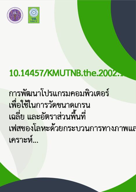 | Title | การพัฒนาโปรแกรมคอมพิวเตอร์เพื่อใช้ในการวัดขนาดเกรนเฉลี่ย และอัตราส่วนพื้นที่เฟสของโลหะด้วยกระบวนการทางภาพและการวิเคราะห์ภาพ / |