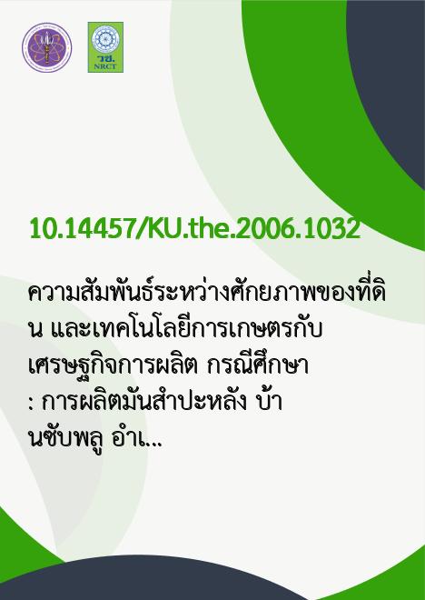 ความสัมพันธ์ระหว่างศักยภาพของที่ดิน และเทคโนโลยีการเกษตรกับเศรษฐกิจการผลิต กรณีศึกษา : การผลิตมันสำปะหลัง บ้านซับพลู อำเภอวังน้ำเขียว จังหวัดนครราชสีมา /เอกรัตน์ วุฒิเวทย์ |