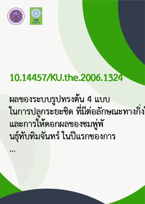ผลของระบบรูปทรงต้น 4 แบบ ในการปลูกระยะชิด ที่มีต่อลักษณะทางกิ่งใบ และการให้ดอกผลของชมพู่พันธุ์ทับทิมจันทร์ ในปีแรกของการให้ผลผลิต /พนม สุทธิศักดิ์โสภณ |