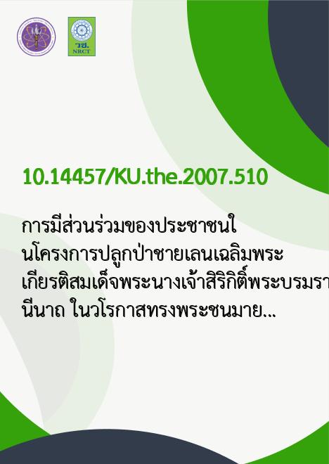 | Title | การมีส่วนร่วมของประชาชนในโครงการปลูกป่าชายเลนเฉลิมพระเกียรติสมเด็จพระนางเจ้าสิริกิติ์พระบรมราชินีนาถ ในวโรกาสทรงพระชนมายุ 72 พรรษา จังหวัดสมุทรปราการ |