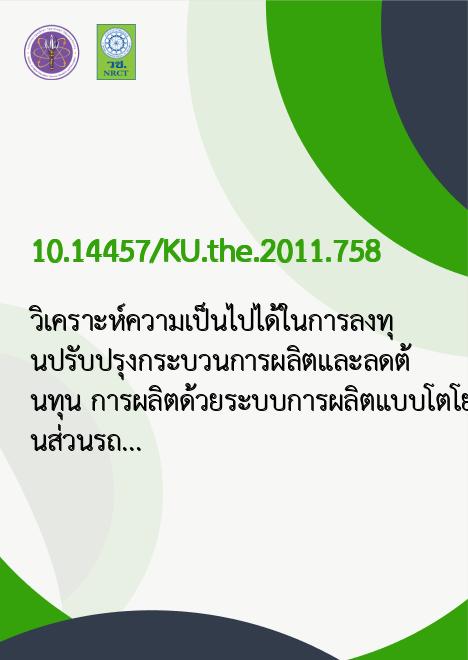 | Title | วิเคราะห์ความเป็นไปได้ในการลงทุนปรับปรุงกระบวนการผลิตและลดต้นทุน การผลิตด้วยระบบการผลิตแบบโตโยต้าของบริษัทผลิตชิ้นส่วนรถยนต์ ในนิคมอุตสาหกรรมอีสเทิร์นซีบอร์ด จังหวัดระยอง |