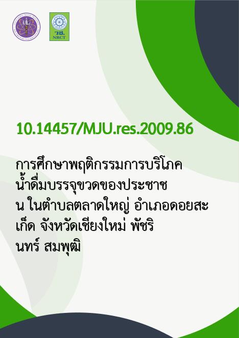| Title | การศึกษาพฤติกรรมการบริโภคน้ำดื่มบรรจุขวดของประชาชน ในตำบลตลาดใหญ่ อำเภอดอยสะเก็ด จังหวัดเชียงใหม่ / |