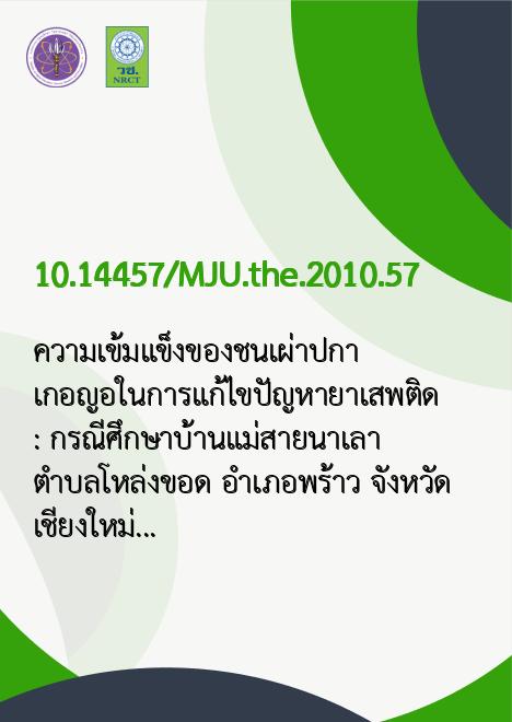 | Title | ความเข้มแข็งของชนเผ่าปกาเกอญอในการแก้ไขปัญหายาเสพติด : กรณีศึกษาบ้านแม่สายนาเลา ตำบลโหล่งขอด อำเภอพร้าว จังหวัดเชียงใหม่ / |