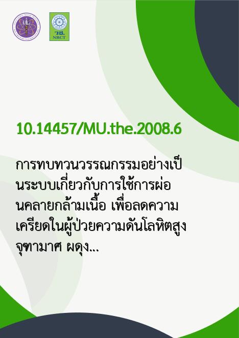 | Title | การทบทวนวรรณกรรมอย่างเป็นระบบเกี่ยวกับการใช้การผ่อนคลายกล้ามเนื้อ เพื่อลดความเครียดในผู้ป่วยความดันโลหิตสูง |