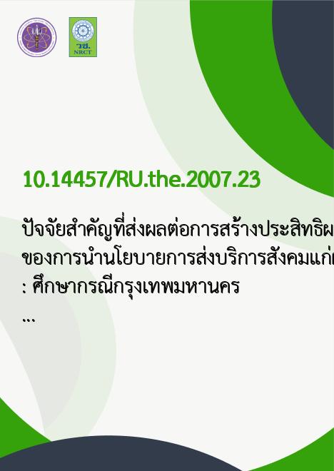 | Title | ปัจจัยสำคัญที่ส่งผลต่อการสร้างประสิทธิผล ของการนำนโยบายการส่งบริการสังคมแก่ผู้สูงอายุไปปฏิบัติ : ศึกษากรณีกรุงเทพมหานคร / |