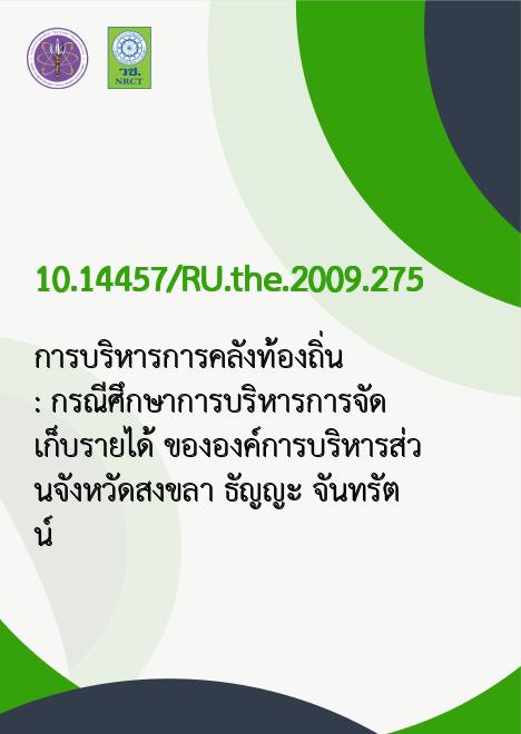 | Title | การบริหารการคลังท้องถิ่น : กรณีศึกษาการบริหารการจัดเก็บรายได้ ขององค์การบริหารส่วนจังหวัดสงขลา / |