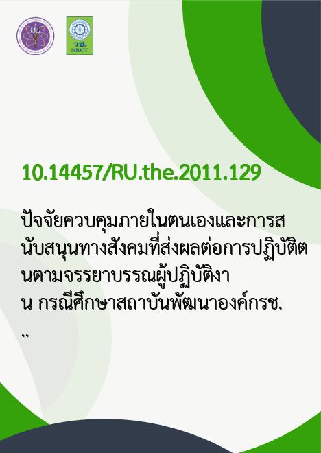 ปัจจัยควบคุมภายในตนเองและการสนับสนุนทางสังคมที่ส่งผลต่อการปฏิบัติตนตามจรรยาบรรณผู้ปฏิบัติงาน กรณีศึกษาสถาบันพัฒนาองค์กรชุมชน(องค์การมหาชน) /บุญญิกา ตันชัชวาล |