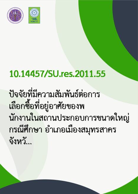 ปัจจัยที่มีความสัมพันธ์ต่อการเลือกซื้อที่อยู่อาศัยของพนักงานในสถานประกอบการขนาดใหญ่ กรณีศึกษา อำเภอเมืองสมุทรสาคร จังหวัดสมุทรสาคร |