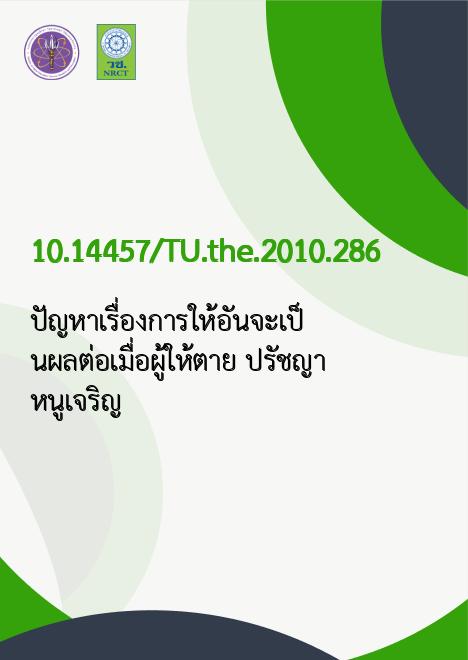 ปรัชญา หนูเจริญ. 2553. ปัญหาเรื่องการให้อันจะเป็นผลต่อเมื่อผู้ให้ตาย /. ม.ป.ท.:มหาวิทยาลัยธรรมศาสตร์,; 10.14457/TU.the.2010.286
